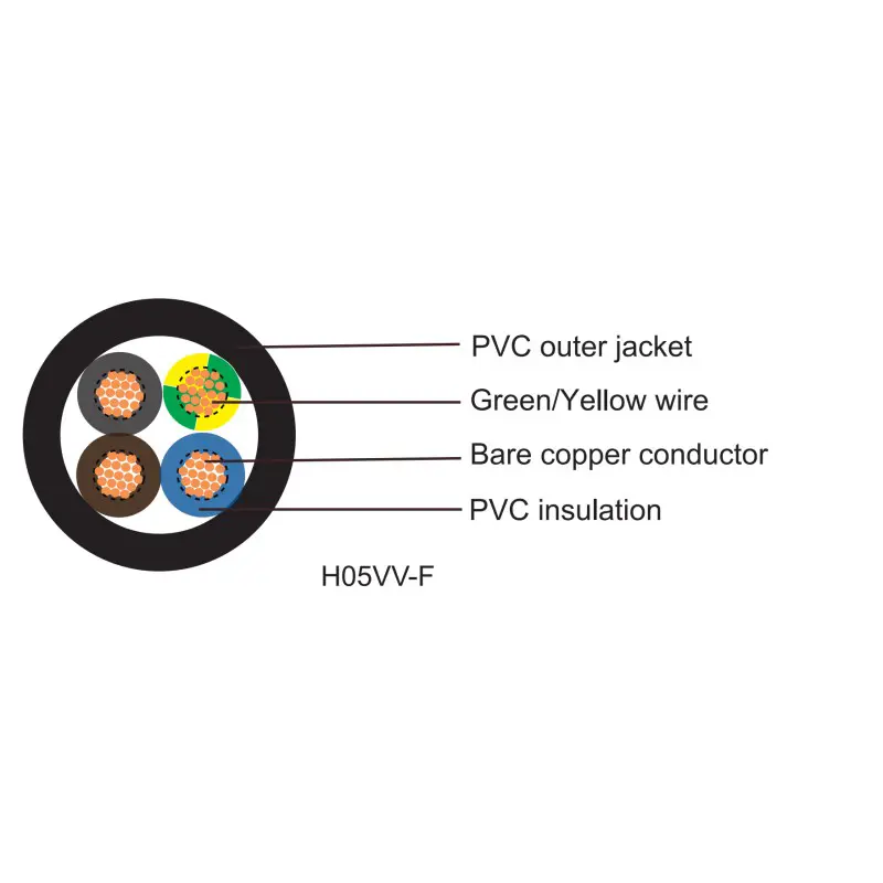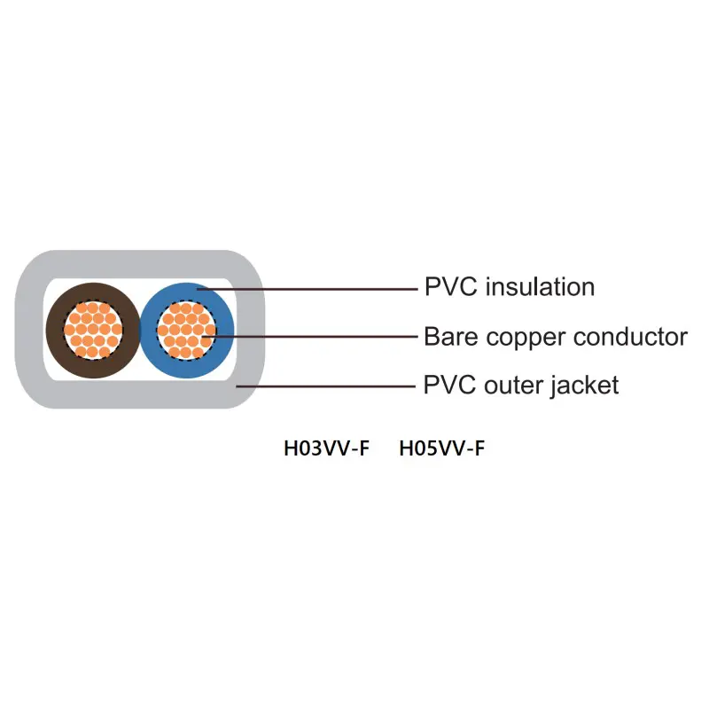 H05VV-F、H05VVH2-F、H03VV-F、H03VVH2-F は、クラス 5 の細銅導体、鉛フリー PVC 絶縁体およびシースで構成されています。